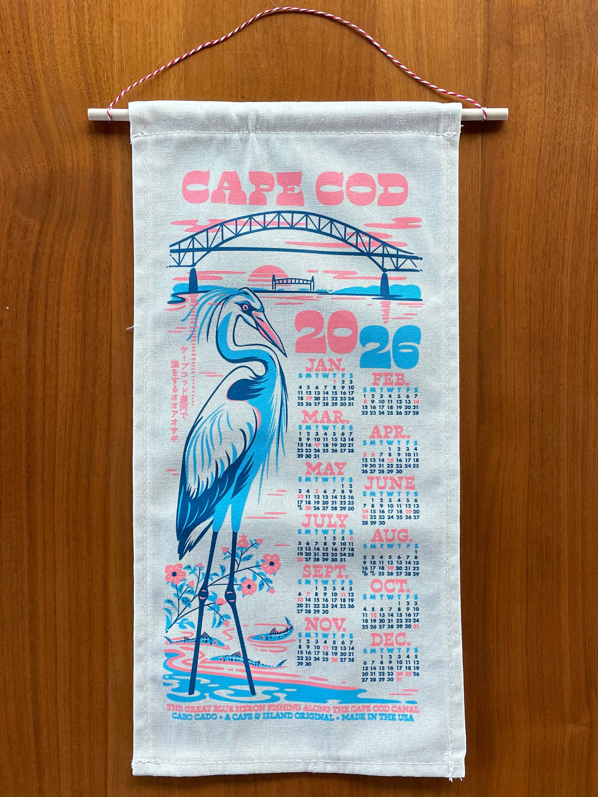 2026 Cape Cod Calendar One of my favorite fisherman I see in the Summertime is *The great blue heron fishing along the Cape Cod Canal. This years print is inspired by Japanese artwork depicting this majestic bird. The Japanese text matches *the description at the bottom of the calendar. Each calendar includes 5 x 7 New Year note card printed here on Cape Cod. Measuring 9.5"W x 19"H with a 12" by 3/8 wood dowel3 color silk screen on 100% environmentally friendly cotton, Made in the USA. Wishing all well today and in the new year! THANK YOU!